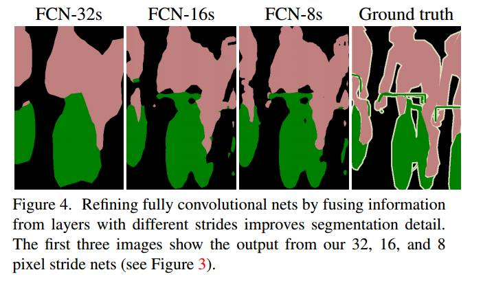 图4. 通过整合不同步长的跨层信息来改善全卷积网络,改进分割细节。前三张图展示的分别是步长为32、16和8像素的网络的输出。