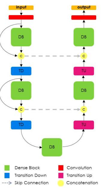 Tiramisu模型基于DensNet,后者是近期提出的一种所有层都是全连接层的图像分类模型。而且同Unet一样,Tiramisu也在升采样层上添加了一些skip connection。