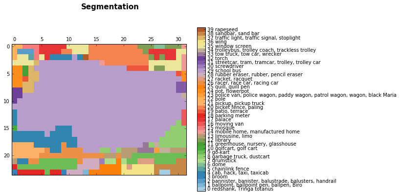 这些结果是这样得来的:将全连接层转化为(或维持)它的原始形状,维持其空间特征不变,得出一个全卷积神经网络(FCN)。在上面的例子中,我们将一个768*1024的图像输入到VGG中,结果得到了一个24*32*1000的卷积层。24*32的图像是池化后的图像(1/32大小),1000是图像网络类别数,据此我们可以推导出上文中的语义分割。