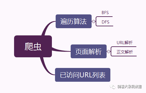 我们开始聊一聊爬虫的设计和实现。爬虫有几个设计要点:遍历算法的选择、页面内容的解析和维护已访问URL的列表,请看下面的思维导图。