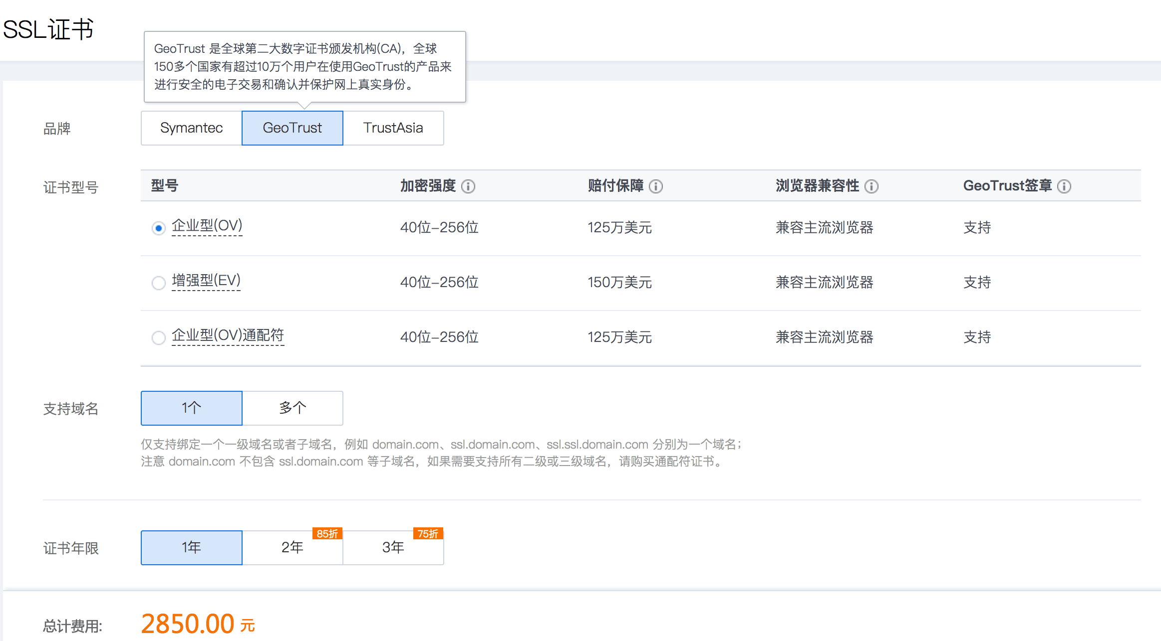 不管怎么样,搞一个https还是很有必要的,至少不要让别人以为那个广告是你自己的网站打的。那怎么建立一个https的网站呢?我在《https连接的前几毫秒发生了什么》已经简单介绍过,需要购买SSL的证书,网上也有一些免费的证书。在某家证书购买机构可以看到证书的分类和价格: