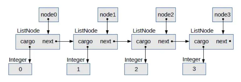 图 3.1 是一个对象图,展示了这些变量及其引用的对象。在对象图中,变量的名称出现在框内,箭头显示它们所引用的内容。对象及其类型(如ListNode和Integer)出现在框外面。