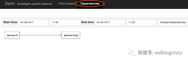再打开http://localhost:9411/的界面,点击Dependencies,可以发现服务的依赖关系: