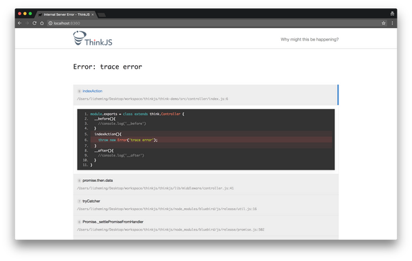 Node.js 开发中一个比较头疼的问题就是错误处理问题,遇到问题后查错和定位问题后比较麻烦,尤其是使用了 Babel 转译之后,为此我们专门开发了 think-trace 模块用来跟踪错误问题,能够更加友好的捕捉显示错误堆栈信息。