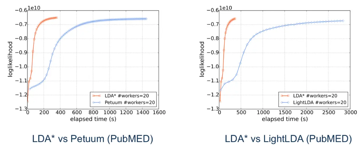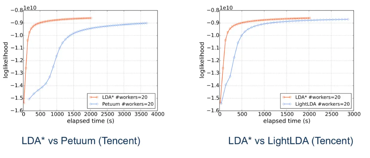 在腾讯真实的推荐数据集上,LDA*是Petuum的9倍,是lightLDA的2.6倍。