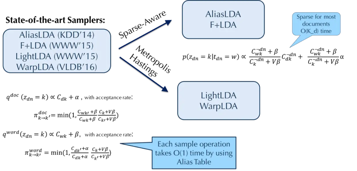 目前业界已有的LDA方法包括AliasLDA,F+LDA,LightLDA和WarpLDA。其中AliasLDA和F+LDA利用主题模型参数的稀疏性质使得模型的采样复杂度降低到了O(Kd),而的上限是文档的长度和话题个数K中的较小值;LightLDA和WarpLDA则利用Metropolis-Hastings方法,逐一地从两个较为简单的proposal分布中进行采样(qdoc和qword),再根据Metropolis-Hastings方法计算采样结果的接受率,因为利用了Alias Table来进行采样,LightLDA和WarpLDA每次采样只需要O(1)的计算复杂度。