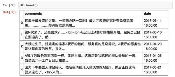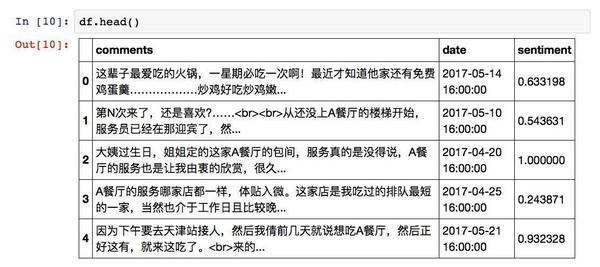 新的列sentiment已经生成。我们之前介绍过,SnowNLP的结果取值范围在0到1之间,代表了情感分析结果为正面的可能性。通过观察前几条数据,我们发现点评网站上,顾客对这家分店评价总体上还是正面的,而且有的评论是非常积极的。
