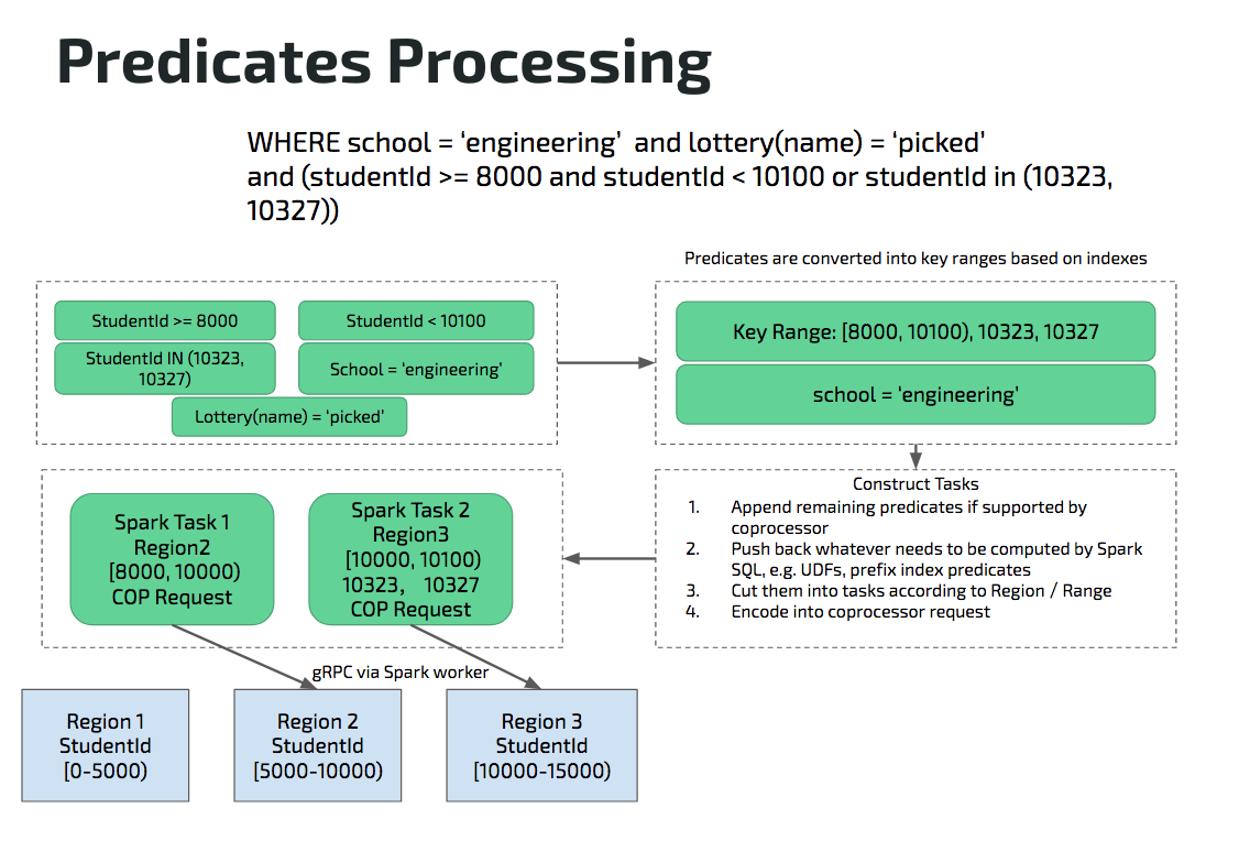 第一步,整个处理,假设说我们索引选中的是在 studentID 上的聚簇索引。studentID 相关的谓词可以转化为区间 [8000, 10100), 10323, 10327。然后是 school=‘engineer’,因为它没有被任何索引选择,所以是一个独立的条件。这两种不同的条件,一个是跟聚簇索引相关的,可以转化成 Key Range,另外一个是跟索引没有关系的独立的谓词。两者会经过不同的处理,聚簇索引相关的谓词转化成 Key Range,独立的谓词 school=‘engineer’ 会变成 Coprocessor 的 Reqeust,然后进行 gRPC 的编码,最后把请求发过去。聚簇索引相关谓词转化的 Key Range 会通过查询 Placement Driver 取得 Region 的分布信息,进行相应的区间切割。假设说有三个 Region。Region 1 是 [0, 5000),是一个闭开区间,然后 Region 2 是 [5000, 10000)。接着 Region 3 是 [10000, 15000)。对应我们上面的 Request 下推的区间信息你可以看到,谓词区间对应到两个 Region:Region 2 和 Region 3,Region1 的数据根本不用碰,Region 2 的数据会被切成 [8000, 10000),因为对应的数据区间只有 [8000, 10000)。然后剩下的 [10000, 10100) 会单独放到 Region 3 上面,剩下的就是编码 school=‘engineering’ 对应的 Coprocessor Request。最后将编码完成的请求发送到对应的 Region。