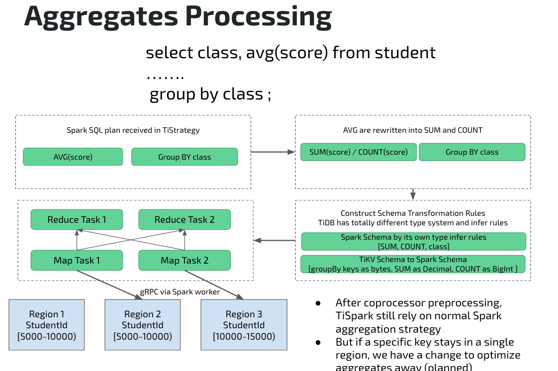 这个例子稍微有一点特殊,因为他是计算平均值,为什么特殊,因为没有办法直接在 TiKV 做 AVG 平均值计算,然后直接在 Spark 再做直接聚合计算,因此这种情况会有一个改写,将 AVG 拆解成 SUM 和 COUNT,然后会把他们分别下推到 Coprocessor,最后在 Spark 继续做聚合计算。