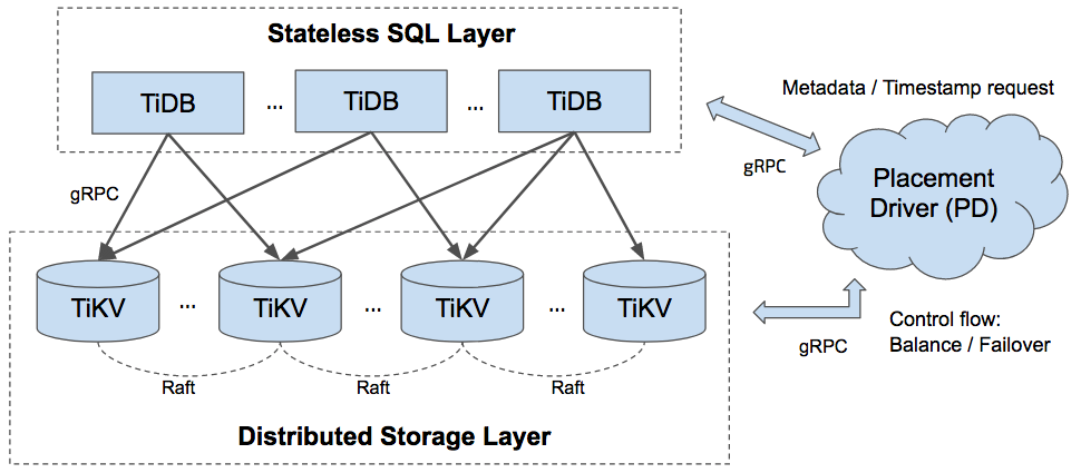 底下是 KV 层,存储层。存储层就是存储数据,通过 Raft 协议来做 Replica 的,旁边还有 Placement Driver(简称 PD),如果对 Hadoop比较了解,你可以认为它有点像 NameNode,它会存储每一个 Region 分别存了哪些 Key,然后 Key Range 是什么。当然它在需要的时候也会做一些数据搬迁的调度,以及 Leader 的自动负载均衡等。最后 PD 提供了统一中央授时功能。