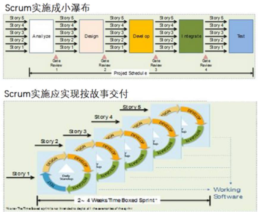 下图就是 Scrum 实施成小瀑布的实例,例如10天 Sprint 被规划成2天需求澄清,2天设计,4天开发,2天测试。这样的后果往往是需求延期,开发时间不足,开发移交质量差,测试不充分等等。