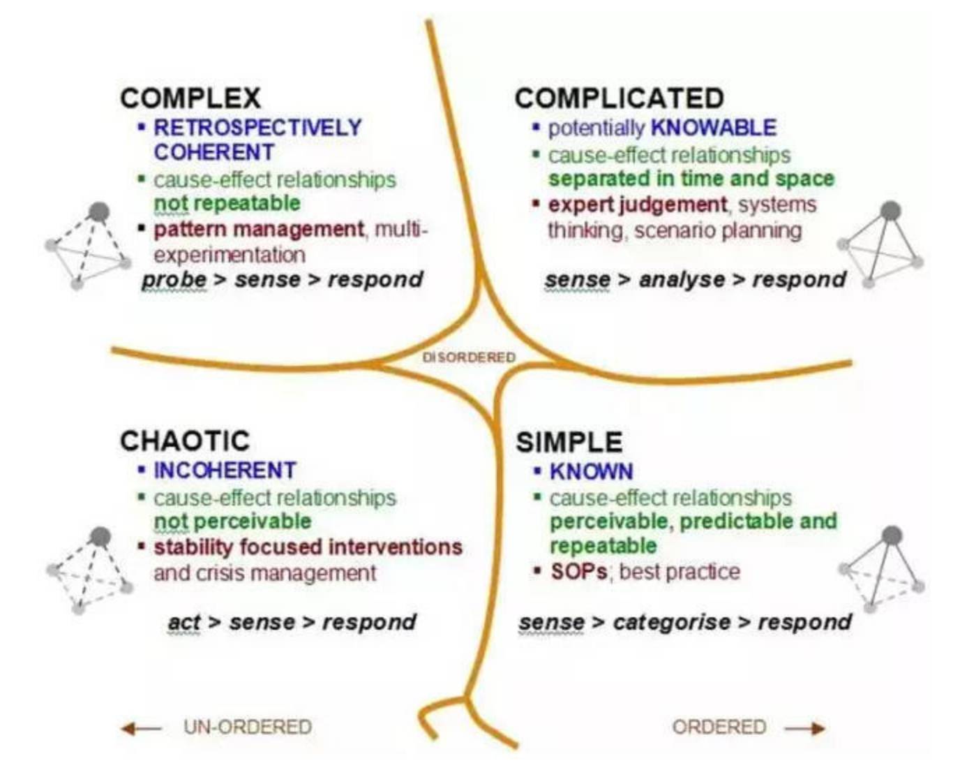 复杂情况下,因果关系是互为循环关系和互相交叉的,表现出巨大的不确定性和复杂度。美国军方称之为 VUCA 时代,投入重金研究在不同场景下如何进行决策。在产品研发和软件工业中,一直都出于复杂领域中,传统 的过程改进和科学管理理论完全不适用,于是引入复杂科学及衍生的管理3.0来解释如何进行管理。