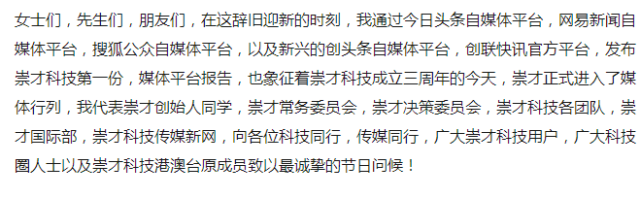 甚至在今年除夕夜,李昕泽发表的节日祝贺中,除了崇才公司的各种委员会、团队、部门,还有广大同行、用户,甚至还没忘了港澳台胞。