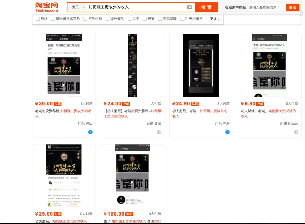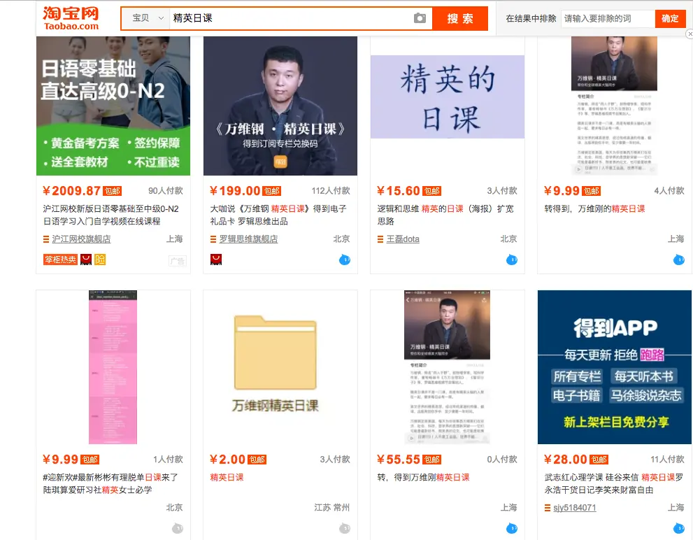 如果你像我一样,几个月前在某宝搜索『薛兆丰』、『李笑来』、『万维钢』等人,可以看到价值从 20-200 不等的几页商品,如果你选中其中的一个,点击-购买-支付,很快你就会收到一个店主私信给你的百度云盘地址,之后你还会被拉到一个百度云盘的分享群中,并在群里被告知,为防资源被和谐,请加入微信群 wxxxx。