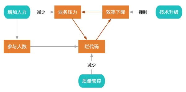 在面临业务压力时,人们通常会倾向于通过增加人力来缓解业务压力。但从系统整体的角度来看,人力增加会造成代码质量变差,开发效率下降,从而再度增大业务压力。这种代码质量越来越差的循环,是熵增定律在软件工程领域的生动体现。