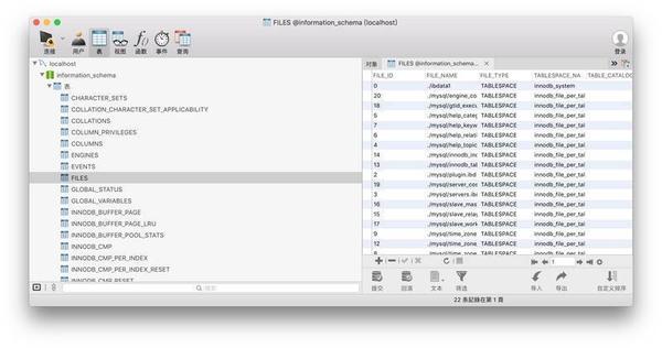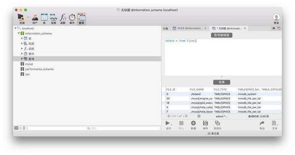 我们会看到出现了右侧出现了查询编辑器。可以在其中输入查询语句了。我们输入一个最简单的查询,看看FILES表格里面都有哪些信息。