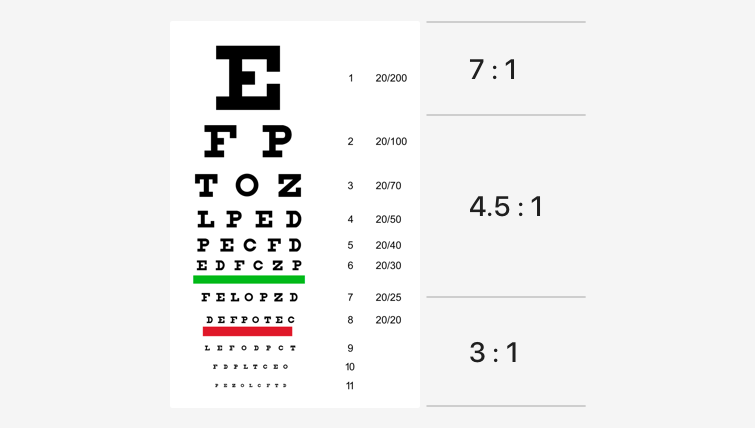 在 IxDC 的一次分享中,Airbnb 的设计负责人 @Vivian Wang @Alex Schleifer 在《如何在全球化设计理念和本土化需求中找到平衡》的主题中给出了视力水平与内容对比度的对应关系。本文末尾的附件中提供了斯奈伦标准视力表文件,感兴趣的同学给自己测一下即可得到自己的视力水平。再根据上文我提到的对比度相关知识多设置几组对比度样本,可以多找些同学多获取些数据,根据得到的结果统计出平均值。注意,结论应充分考虑眼疾患者和室外环境的使用场景。