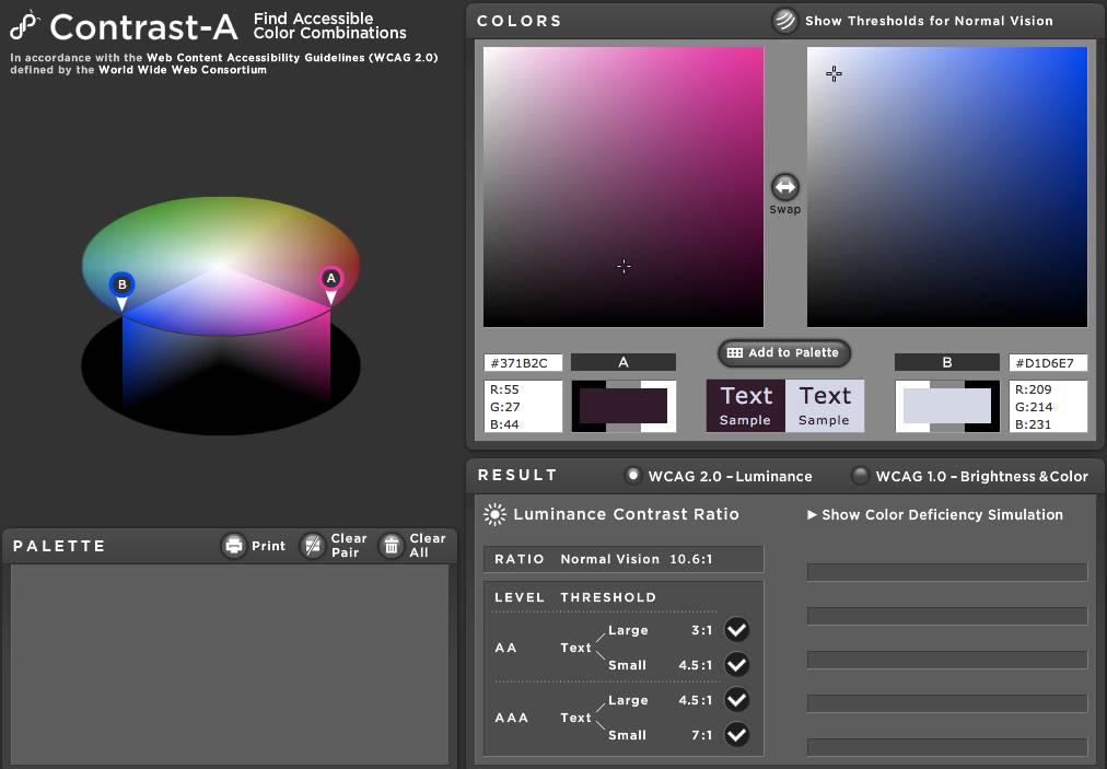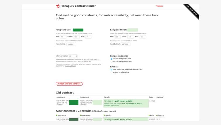 网络上有很多根据此规范设计的在线检测工具,搜索关键词 Color Contrast Accessibility 可以找到很多,笔者这里测试了几个,推荐给大家。