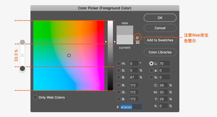 2. 我们可以大致总结个经验。比如我们在调色板中选择字体颜色时为了保证最低 3:1 的对比度,字体色与背景色至少相距 33.3%,其他对比度同理。注意:由于每个通道对亮度的影响效果不同,此方法只适用于灰阶。
