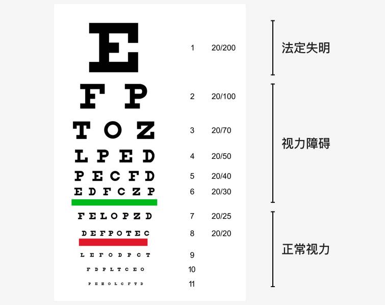 早在 1862 年荷兰眼科医生斯奈伦 (Hermann Snellen) 为了定义视力标准发明了视力表,经不断优化现已成为世界标准,我们常见的 E 字形的视力表也是由此演变而来。视力表由从大到小的字母行组成,每行对应一个分数,受检者在距离视力表 20 英尺(约 6 米)处,所能看清的最小字母行对应的数值即为视力值。视力水平 = 测试距离 / 字母大小。