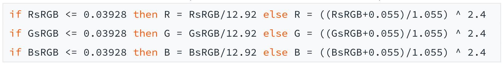 了解对比度首先要知道相对亮度(relative luminance)的概念:相对亮度表达的是单位面积内光线通过的数量。在一个色彩空间内,最暗到最亮的点相对亮度取值范围为 0-1(这种取值方法很常见,比如摄氏度取值范围是规定标准大气压下冰水混合物到沸水温度的取值范围为 1℃-100℃),拿我们日常设计工作中接触最多的色彩空间 sRGB 举例,相对亮度的计算方式为 L = 0.2126 * R + 0.7152 * G + 0.0722 * B (此公式为理论值,RGB 分别对应 8bits/Channel 时的数值,即 0-255)。