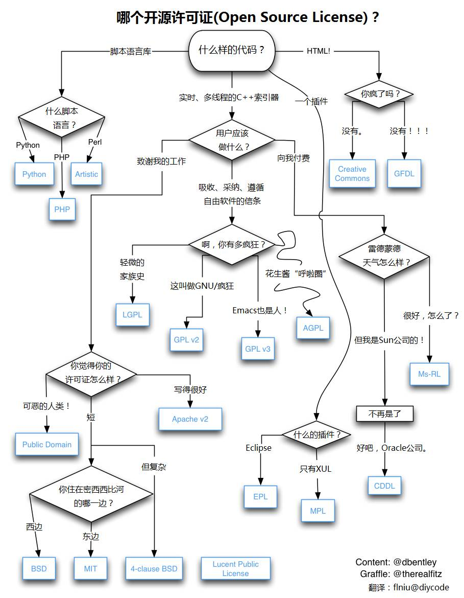 那么到底该选择哪一个 License 呢?乌克兰程序员 Paul Bagwell 画了一张分析图(下图为阮一峰汉化版)