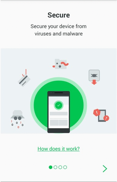 Lookout 也做了很好的提供了进度提示的新手引导。它只有4屏,每页强调一个功能。注意它的文案描述,它告诉用户能用这个APP做什么:他们可以“保护”、“定位”、“防卫”、“备份”。每个动词后面有一小段描述和一些简约的插画来帮助理解。