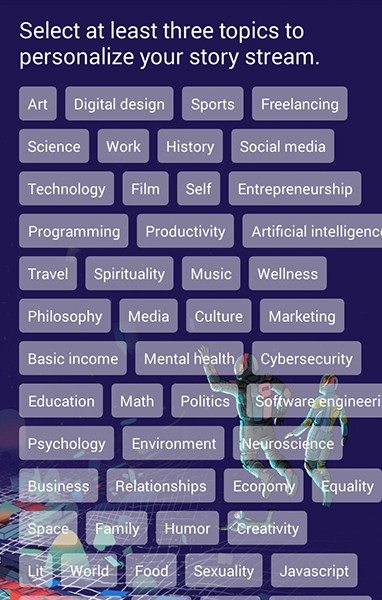 Medium 再次展示了棒棒的新手引导。它们只有两屏:一屏展示价值主张,一屏提供选择故事主题。