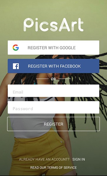 在下面的例子中,PicsArt允许用户选择Google, Facebook 或者邮箱注册。