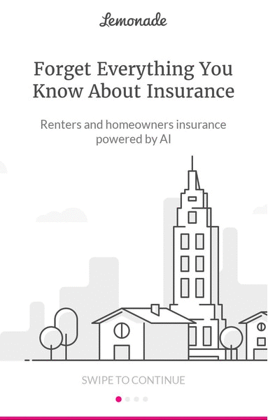 让我们看看 Lemonade。他们的价值主张很有趣 --- 忘记你所知道的关于保险的所有事。你已经了解 Lemonade 是一个和保险有关的APP。第三屏用一些随意的图画和简单的文字介绍核心功能。最后一屏提供一个入口去“查看我们的价格”。用一种简单的方式帮助用户了解更多信息而非用过多信息给用户压力。