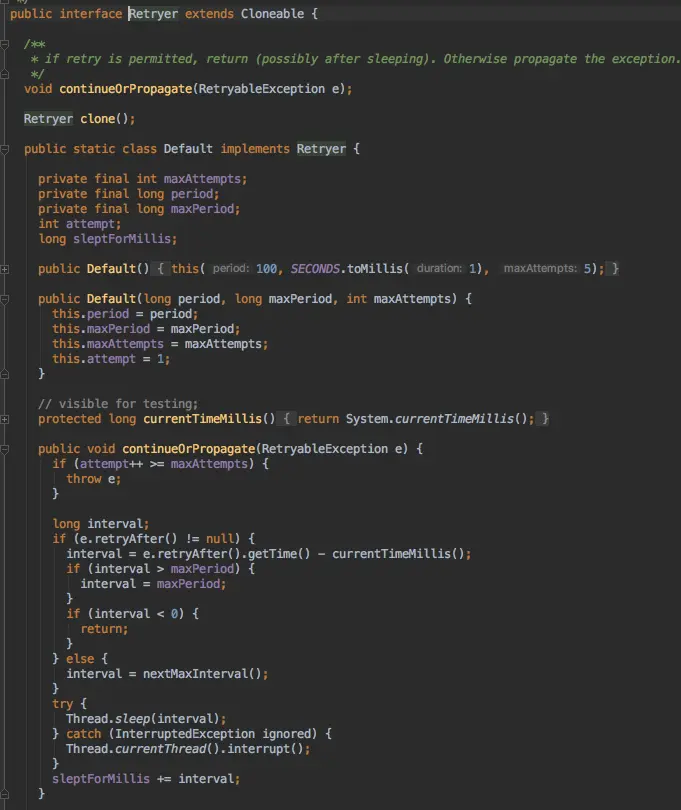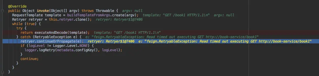 - 回到方法调用入口的catch,进行feign的retryer的逻辑,决定是整体再重试还是直接抛出异常跳出循环(默认是5次重试)
