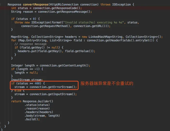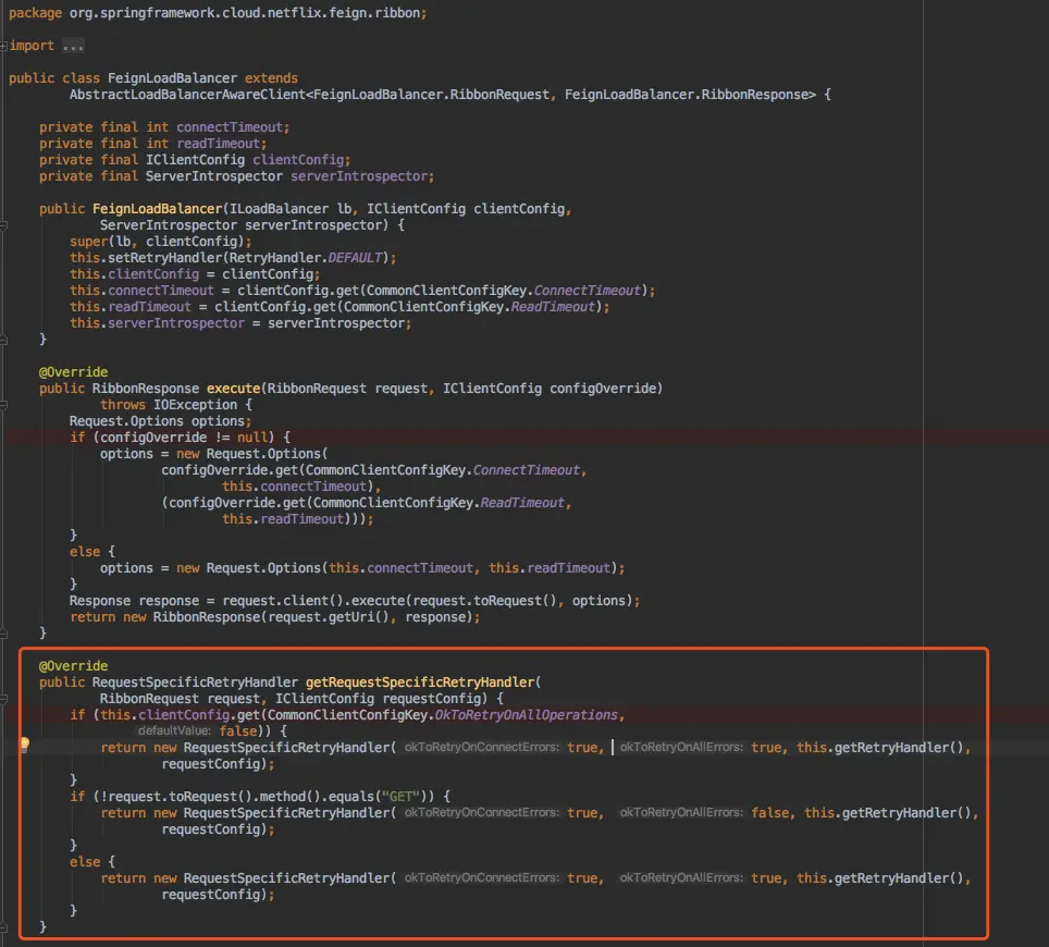 这是feign初始化它的ribbon重试控制器,它的逻辑是如果设置了OKToRetryOnAllOperations这个参数为true,第一个if的构造函数就设置为true,这就比较危险了,如果接口是post或者put请求,这是进行修改操作,如果服务器长时间不返回,客户端发生socket read timeout会进行重试,如果服务器接口没做幂等性,这个后果自己想想。继续看后面两个判断,得出的结论是:如果是Get请求设置为OKToRetryOnAllOperations=true不影响,因为只涉及到读操作,如果是其他http方法,默认只会在socket还没建立连接时进行重试,比如突然网络抖动或者一台服务实例挂了,这是没问题的,因为只保证了服务器端执行一次(还是建议涉及到修改的接口做好幂等性)。