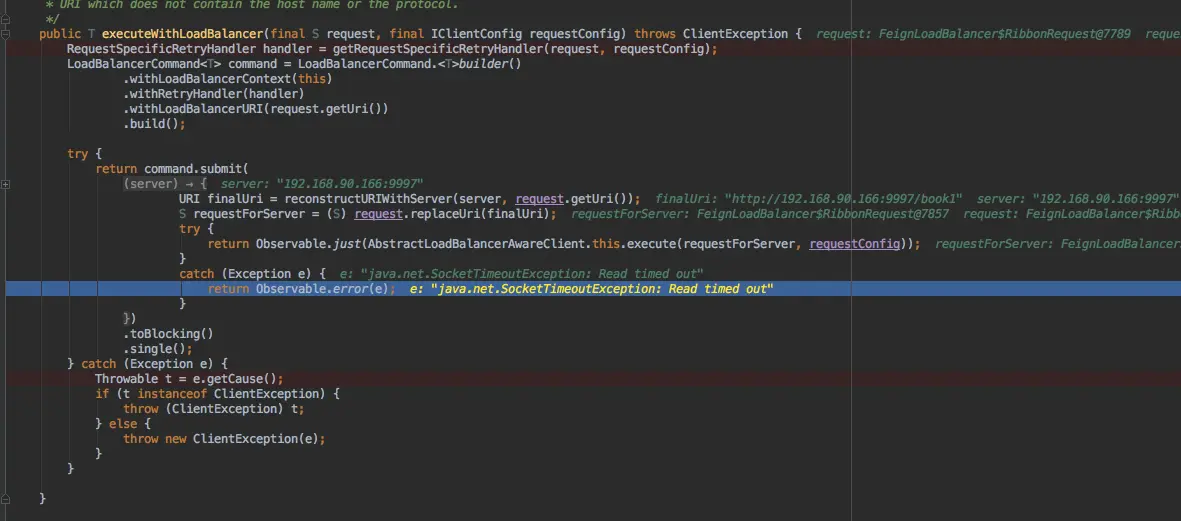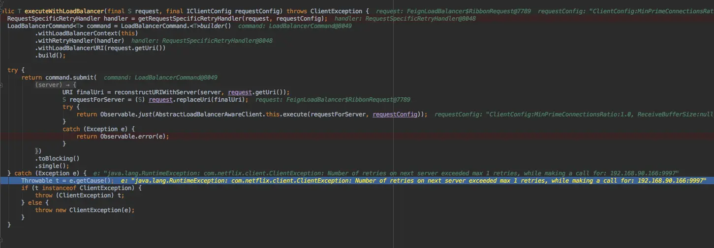 - 第二个catch控制整个一轮ribbon重试(ribbon.MaxAutoRetries、ribbon.MaxAutoRetriesNextServer)下来,仍然异常。
