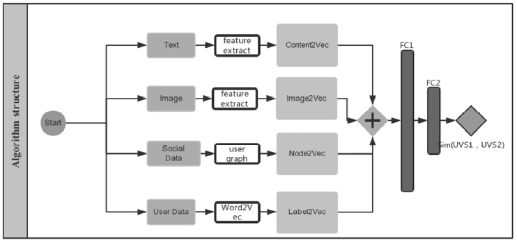 (6)将步骤2345 得到的向量做拼接,经过两层FC,得到表示每个用户的多特征向量集(User Vector Set, UVS)。这里取的输出单元个数时可以根据性能和准确度做平衡,目前英特实现的是输出512 个单元,最后的特征输出表达了用户的社交关系、用户属性、发出的内容、感兴趣的内容等的混合特征向量,这些特征向量将作为下一步比对相似性的输入值。