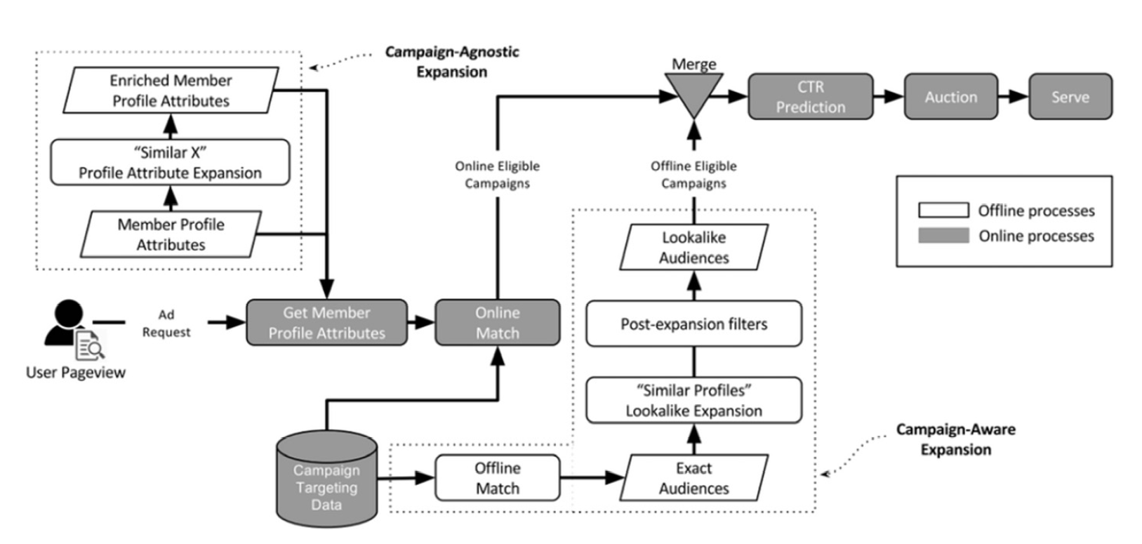 第一篇论文是Linkedin 给出的,主要谈了针对在线社交网络广告平台如何根据已有的受众特征做受众群扩展。这涉及如何定位目标受众和原始受众的相似属性。论文给出了两种方法来扩展受众,一是与营销活动无关的受众扩展,二是与营销活动有关的受众扩展。