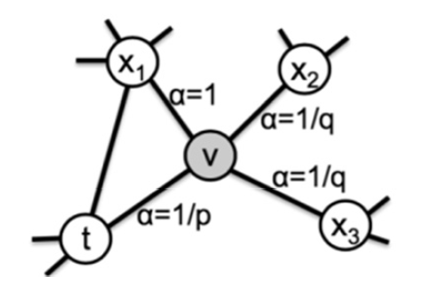 下面来看看node2vec 中的关键技术——随机游走算法,它定义了一种新的遍历网络中某个节点的邻域的方法,具体策略如下图所示。