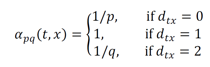 其中dtx表示节点t 到节点x 之间的最短路径,dtx= 0表示会回到节点t 本身,dtx = 1表示节点t 和节点x 直接相连,但是在上一步却选择了节点v,dtx= 2表示节点t 不与x 直接相连,但节点v 与x 直接相连。其中p 和q 为模型中的参数,形成一个不均匀的概率分布,最终得到随机游走的路径。与传统的图结构搜索方法(如BFS和DFS)相比,这里提出的随机游走算法具有更高的效率,因为本质上相当于对当前节点的邻域节点的采样,同时保留了该节点在网络中的位置信息。