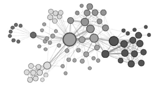 将步骤1 数据准备中获得的用户之间的关系和微博之间的转发评论关系转化成图结构,并提取用户关系sub-graph,最后使用node2vec 算法得到每个用户的社交网络图向量化表示。下图为社交关系化后的部分图示。