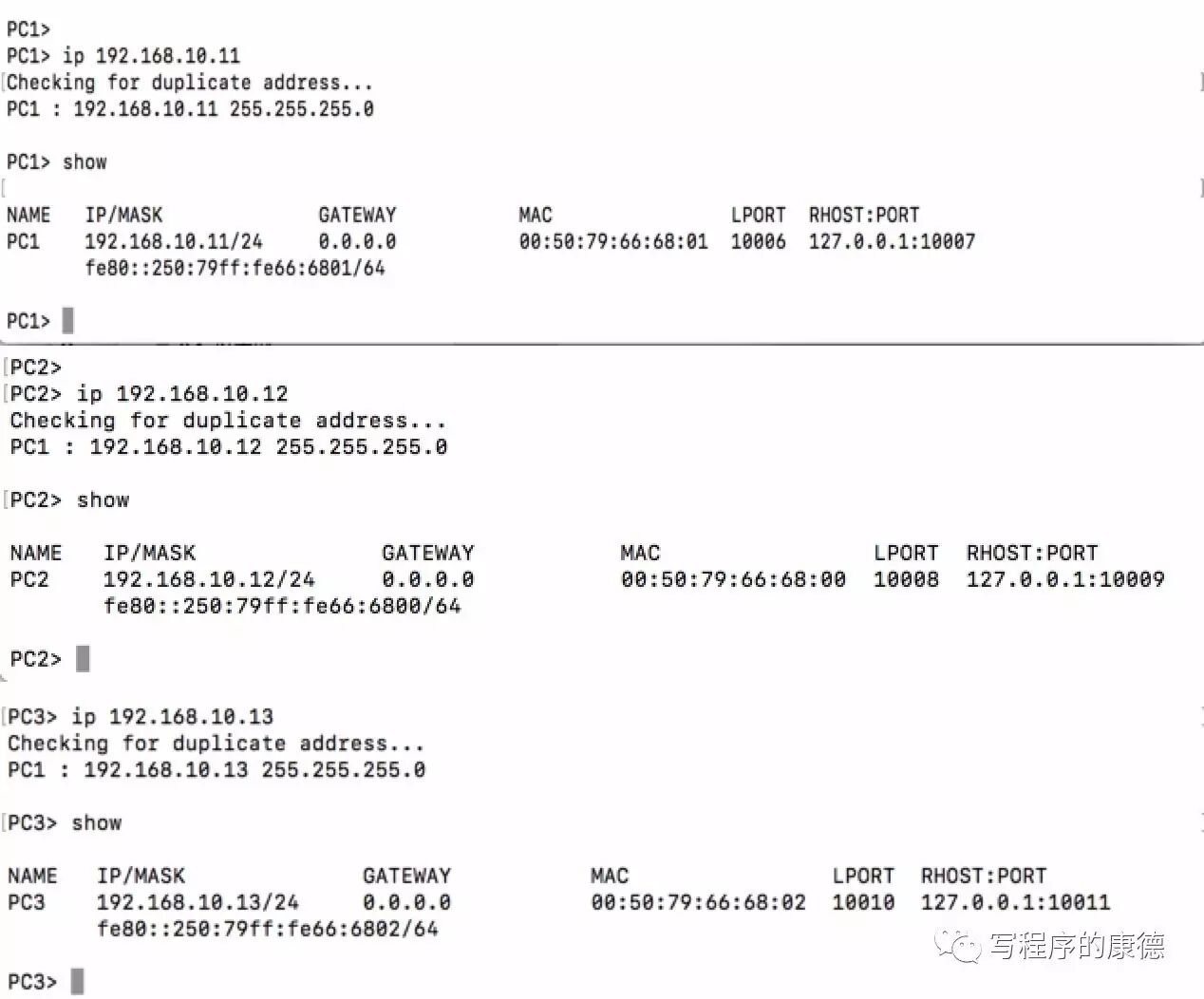 上面的拓扑中有三个终端,我们要做的实验是当PC1和PC2通讯的时候,在Hub1->PC3这条链路上是否能收到数据包。先配置PC1、PC2、PC3的IP地址