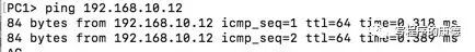PC1收到ICMP的回复数据包,显示一条 “84 bytes from 192.168.10.12 icmp_seq=1 ttl=64 time=0.649 ms”提示;