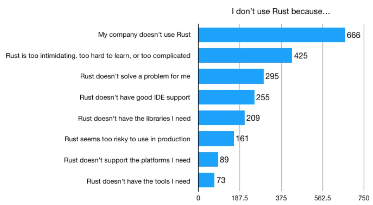学习曲线和语言复杂度是许多用户不愿意接受 Rust 的原因。此外,调查显示,更多的人不去学习 Rust 还是因为 Rust 没有足够的活跃商业项目让它成为企业的一部分。
