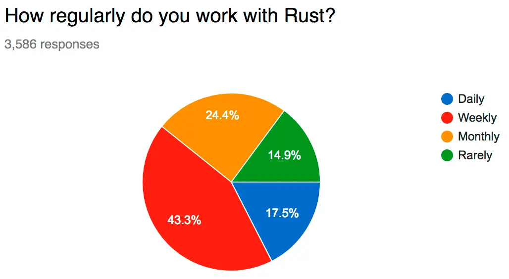 不过,尽管开发者用 Rust 编写代码的量在增多,但在使用频率上,每天使用和每周使用的数据都有小幅下滑。 日使用用户从去年的 19% 下降至 17.5% ,周使用用户从 48.8% 下降到 43.3% 。