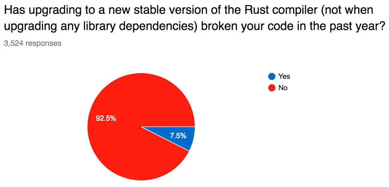 在稳定性上,Rust 编译器有明显改善。去年有 16.2% 的用户表示,升级到新的稳定版 Rust 编译器会破坏他们的代码。今年,这一数字下降到了 7.5%。