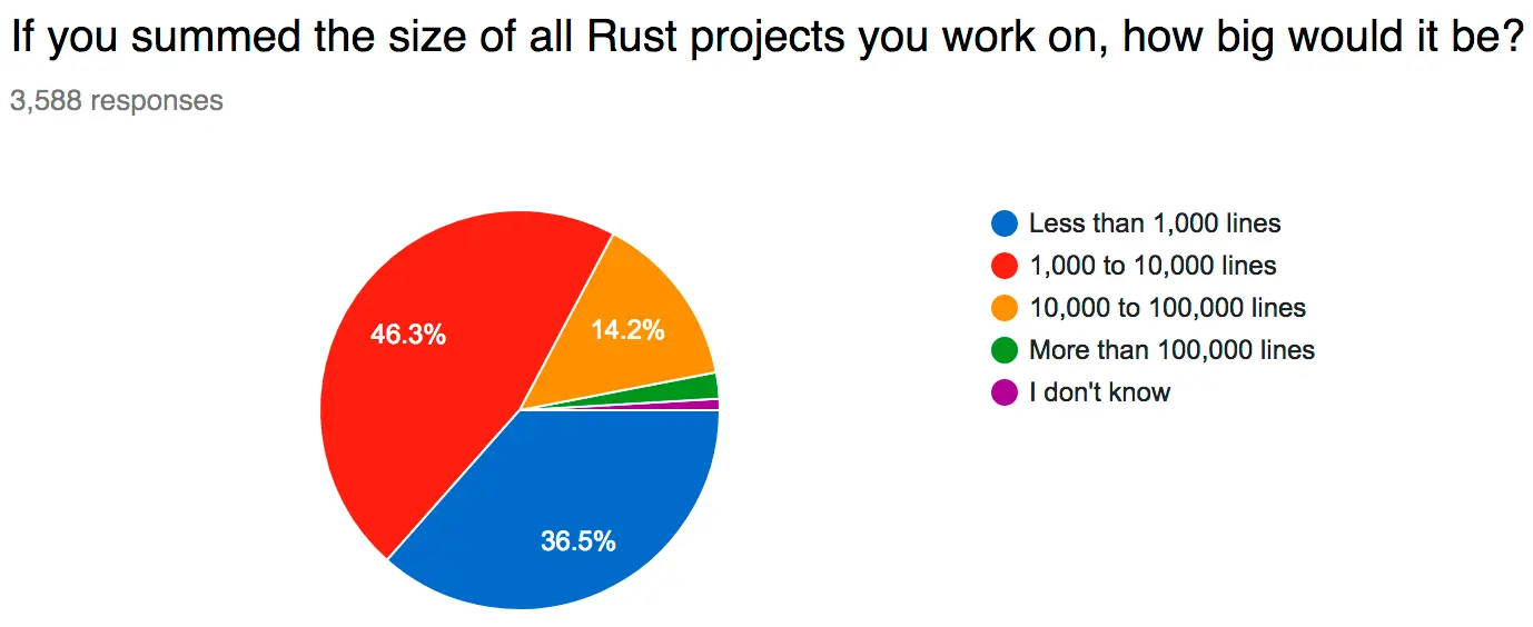 Rust 目前主要被用于小型和中型项目,大型项目占比 16%(高于去年的 8.9%),这也表明用户越来越有兴趣将 Rust 用在大型项目当中。