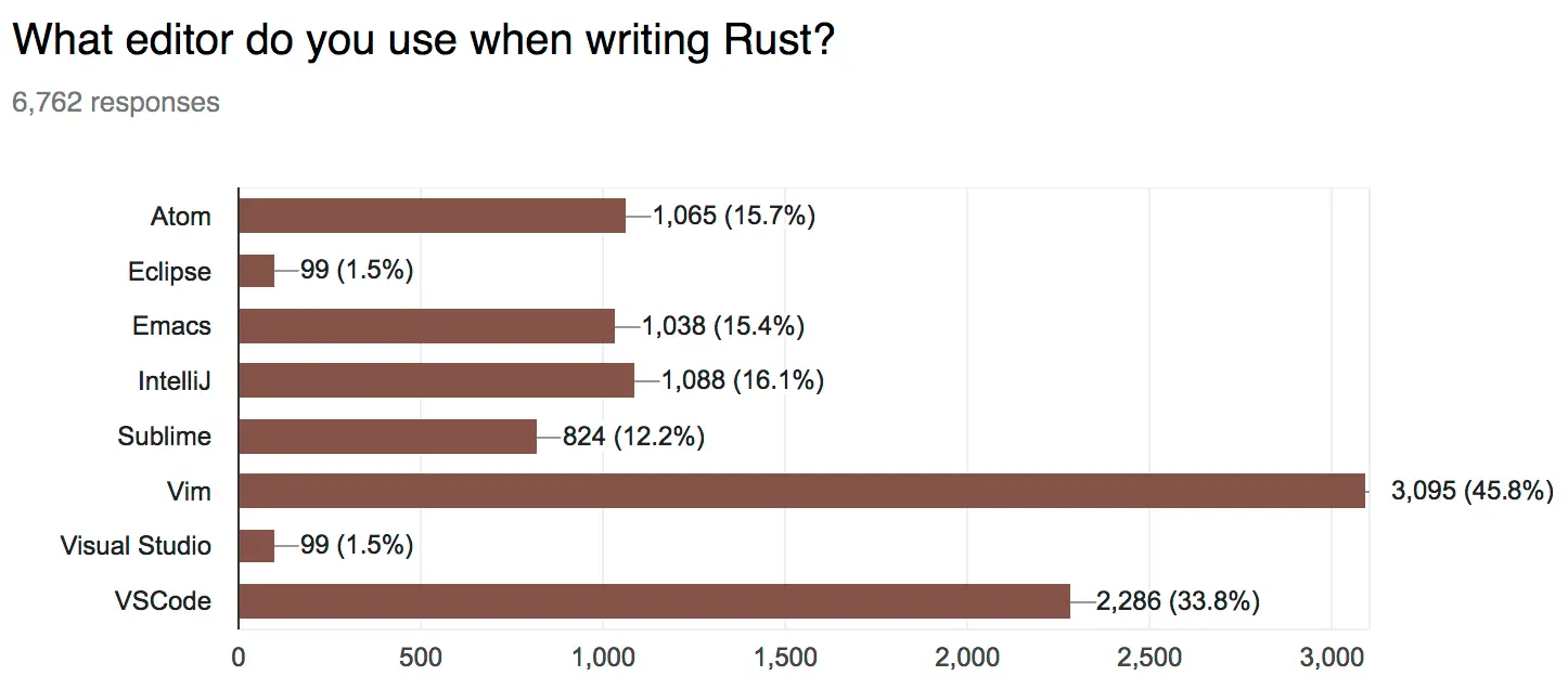 编辑器方面,vim 仍然最受欢迎,但 VSCode 增速十分迅速,从去年的 3.8% 跃至 34.1%。Atom、Emacs、IntelliJ 占比相差不大。