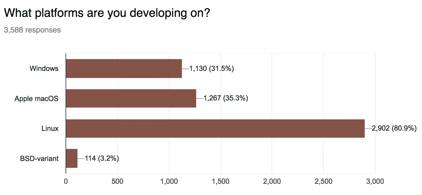 Linux 依然是 Rust 开发者最主要使用的平台,Windows 31.5% 的用户有所增长,高于去年的 27.6% 。