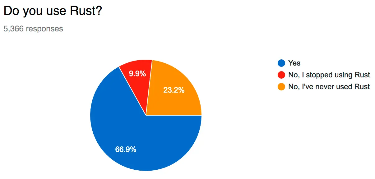 Rust 官方在社区上做了一次调查,以了解用户如何看待 Rust 的发展。调查共收到 5368 份回复,其中有 大约 2/3 的是 Rust 用户,剩下的 1/3 是非 Rust 用户,调查结果如下。