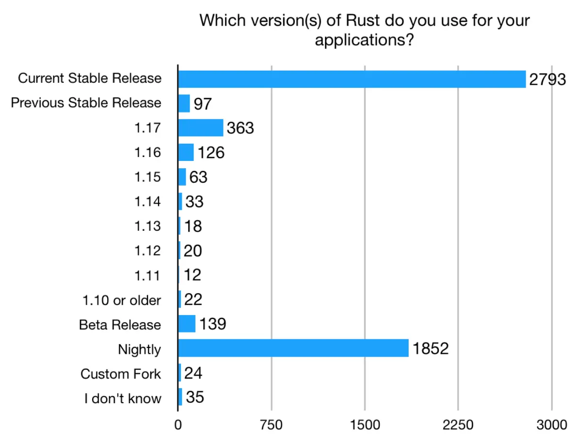 而在版本使用上,开发者除了最新的稳定版之外,还偏向于选择 nightly 版本(每日/夜间构建版),这也侧面说明开发者比较渴望能尽快新的体验和功能。