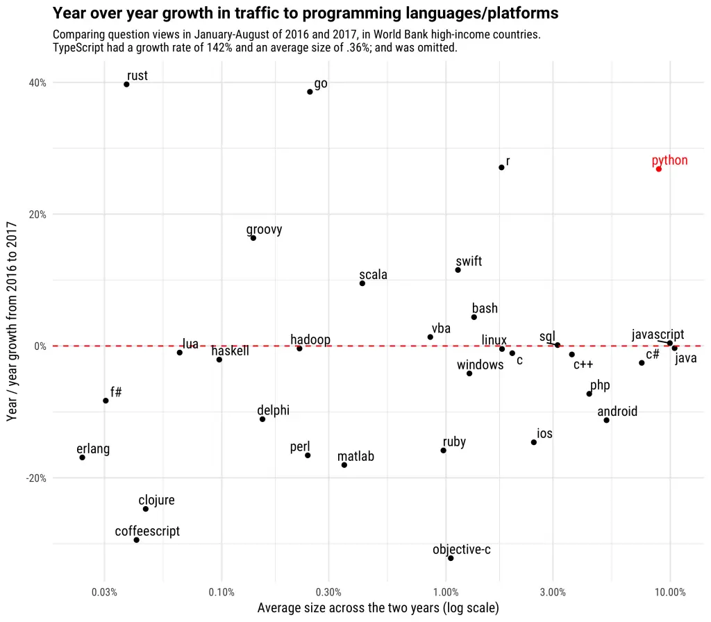 In this post, we’ll explore the extraordinary growth of the Python programming language in the last five years, as seen by Stack Overflow traffic within high-income countries. The term “fastest-growing” can be hard to define precisely, but we make the case that Python has a solid claim to being the fastest-growing major programming language.