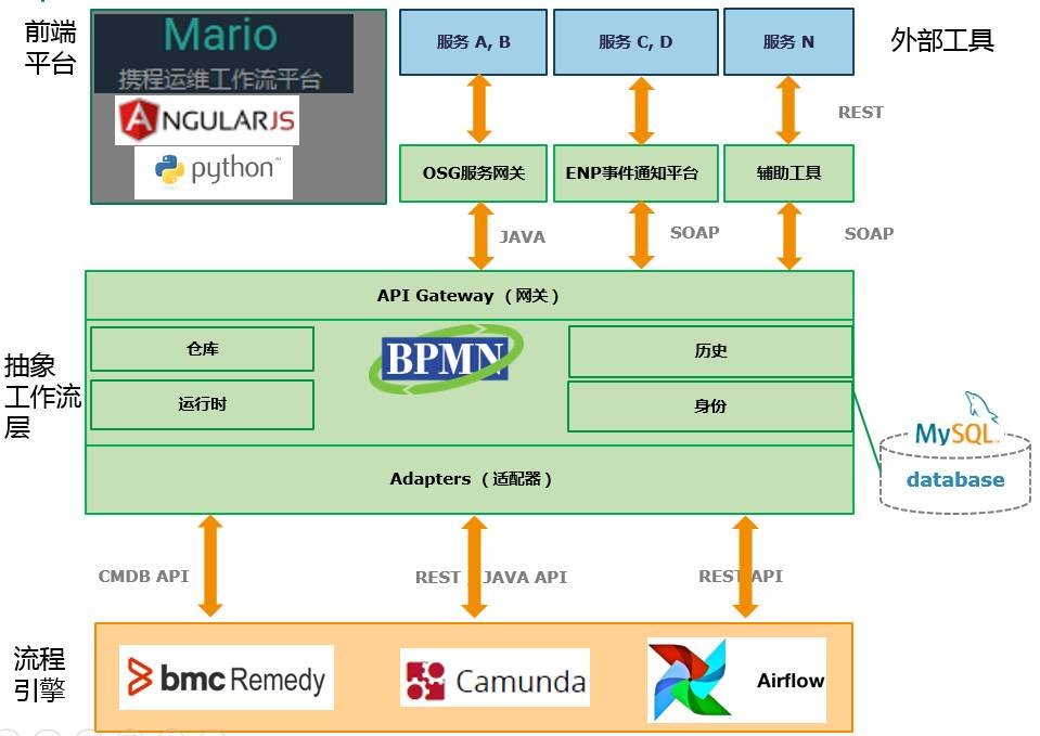 可以对比一下原来的系统架构,大家应该能发现他们之间的主要区别,底层除了原先的Remedy外,可以引入其它的开源流程引擎,比如基于BPMN标准的Camunda,或者Activiti、Airflow、Stackstorm等等,中间也是最核心的就是抽象工作流层,主要以几个模块组成: